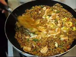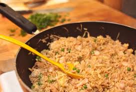 Leftover rice is generally used because the moisture in freshly cooked rice will cause it to steam instead of fry.[4] The oil may be seasoned with aromatics such as garlic before the rice and other ingredients are stir-fried together in a wok. Other ingredients vary: they can include eggs, meat (chicken, beef, or cured pork), seafood (shrimp or lobster), vegetables (carrots, broccoli, bean sprouts, celery, peas, corn), mushrooms, spices and peppers, and soy sauce or sometimes oyster sauce. The base of vegetable fried rice does not contain any meat or seafood; others are named for the primary addition (e.g., "chicken fried rice" or "shrimp fried rice"). Other "house" versions may contain several meats and seafoods. It is often stir-fried in a wok with vegetable oil or pork fat to prevent sticking, as well as for flavor. Onions, scallion and garlic are often added for extra flavor. It is popularly eaten either as an accompaniment to another dish, or as a course by itself.